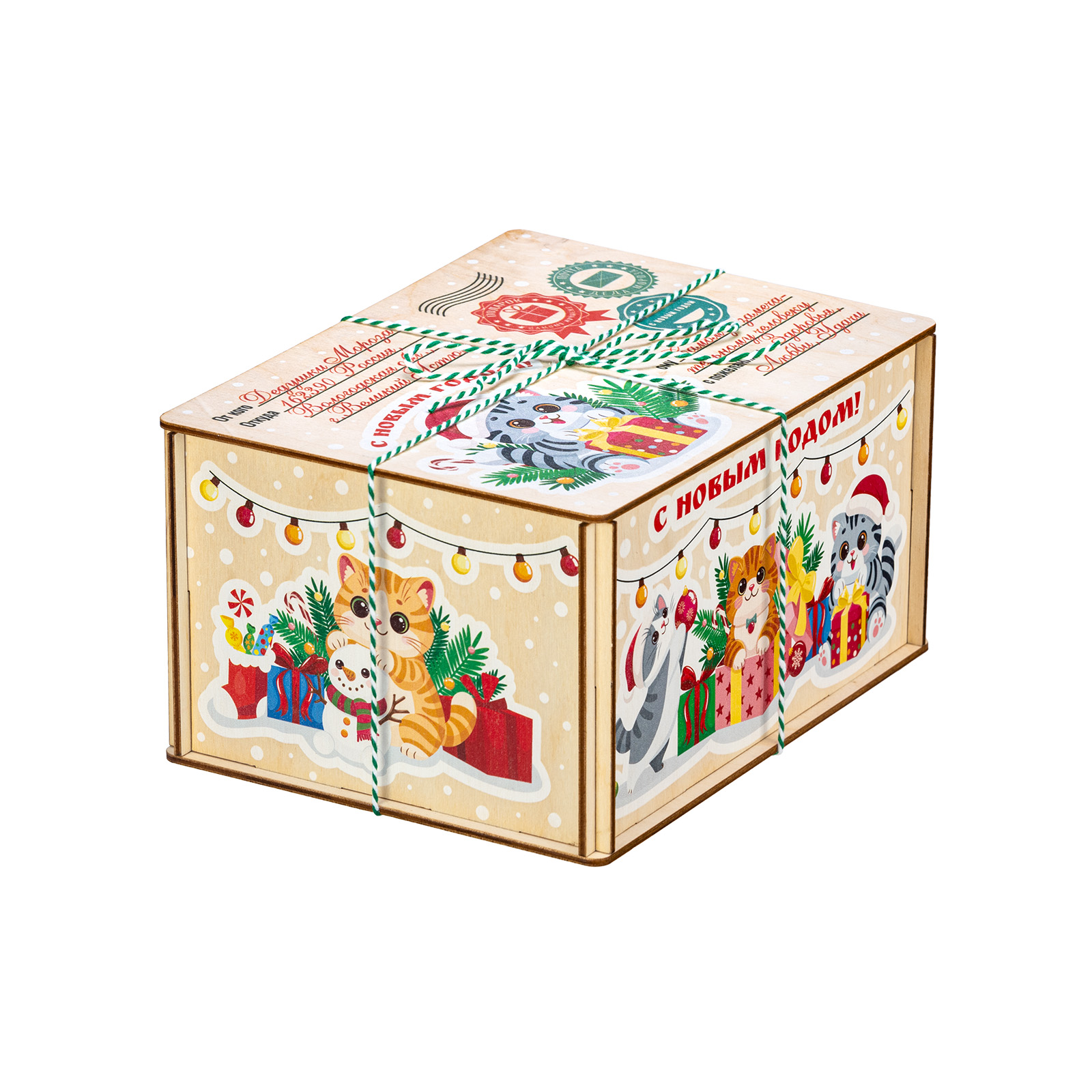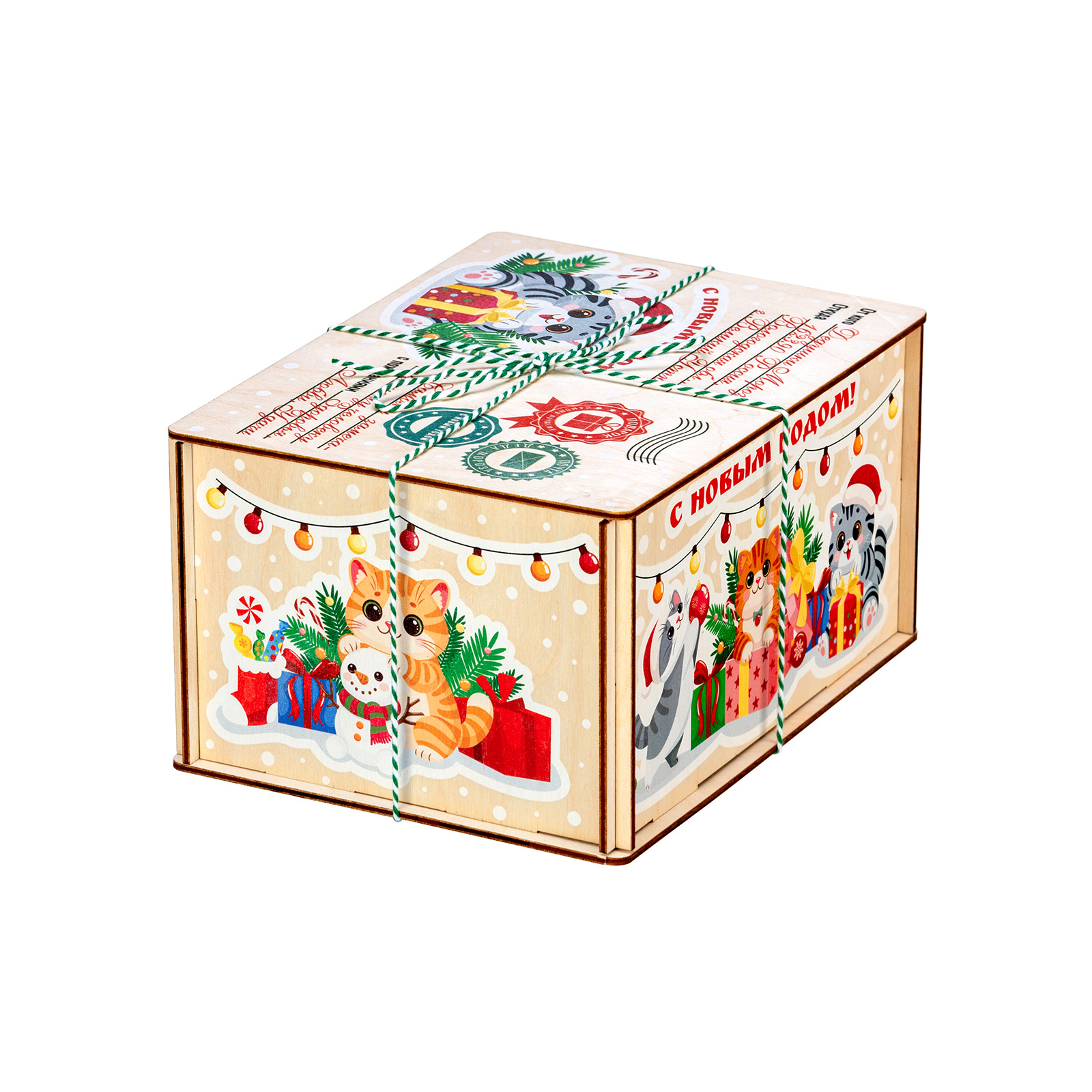 Новогодний сладкий подарок в деревянной упаковке - это сочетание практичности и оригинальности. За счет таких качеств подобные наборы подходят для дарения сластенам любого возраста. “Котики” - небольшой деревянный ящичек, оформленный под самую настоящую почтовую бандероль. Со всех сторон ящик украшен праздничными рисунками с милыми котятами, которые уже во всю готовятся отмечать Новый год. Но самое главное находится внутри - там бережно хранятся самые разнообразные лакомства для новогоднего стола. Здесь каждый сможет найти себе угощение по вкусу!