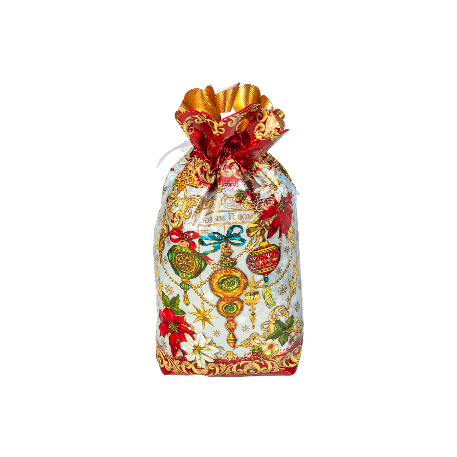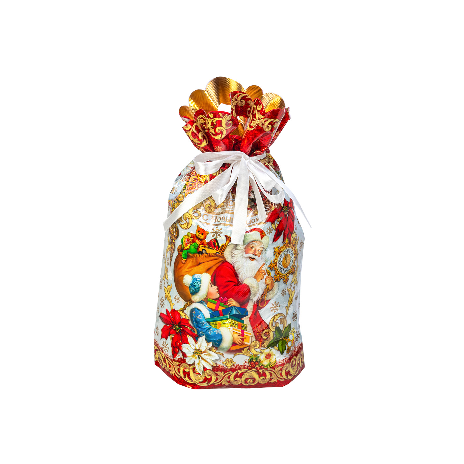 Интересный вариант новогоднего подарка – «Мешок Время чудес». Отлично подойдет на подарок в 2026 году с символом Лошадь. Внутри такого презента находится кондитерский набор весом 900 граммов.