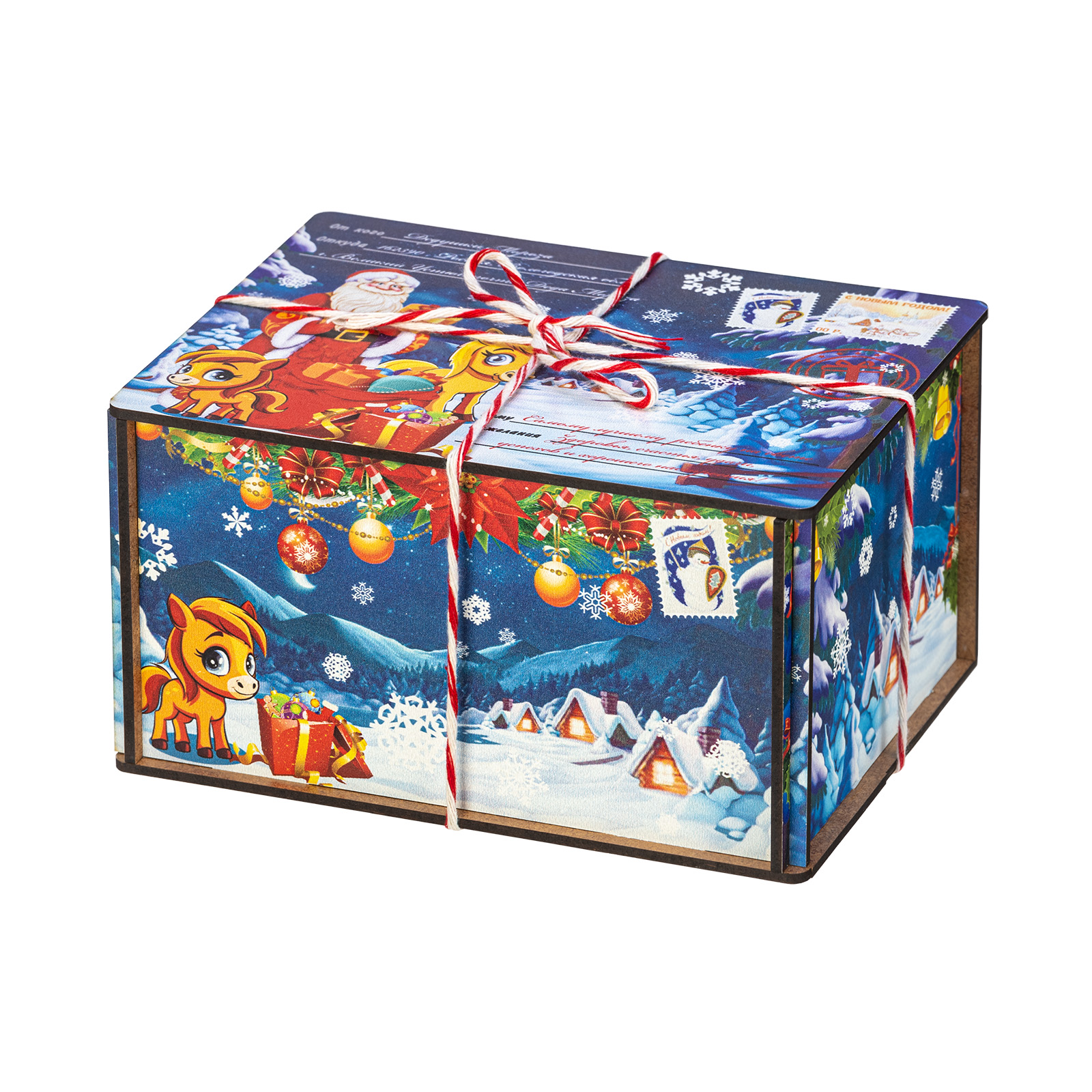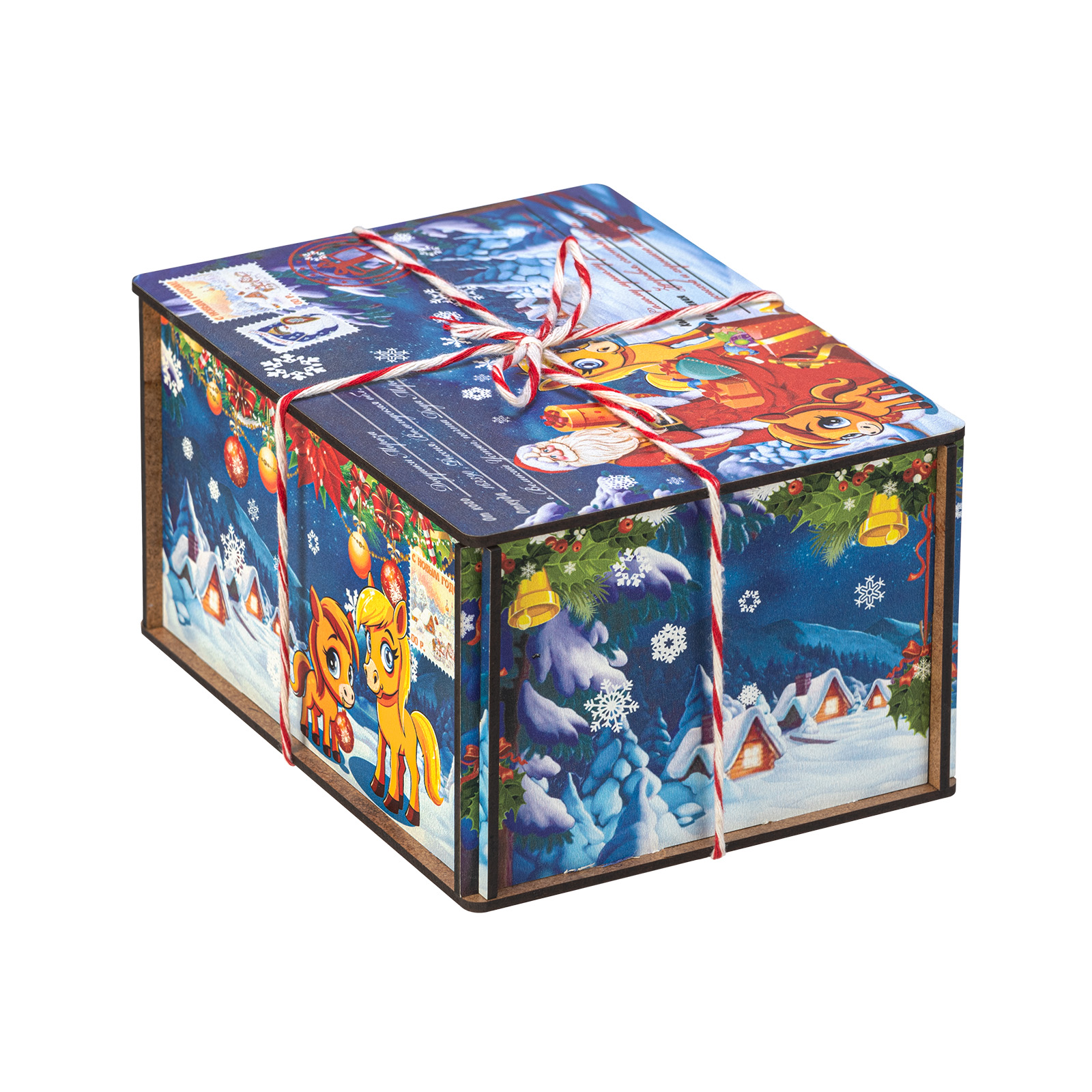 Интересный вариант новогоднего подарка – «Посылка от сказочной лошадки (Полезный состав)». Он представлен в разделе Дерево. Отлично подойдет на подарок в 2026 году с символом Лошадь. Внутри такого презента находится кондитерский набор весом 500 граммов.