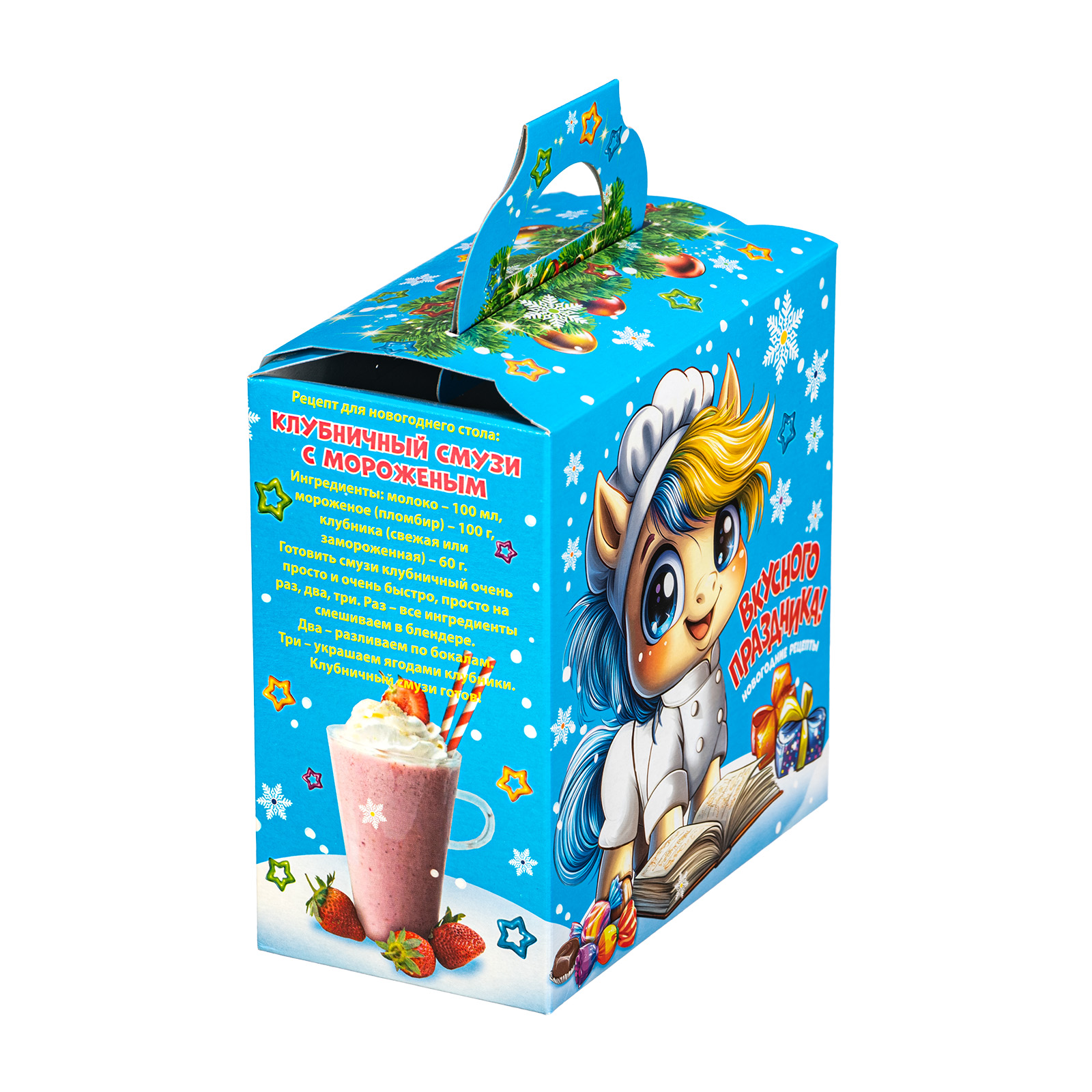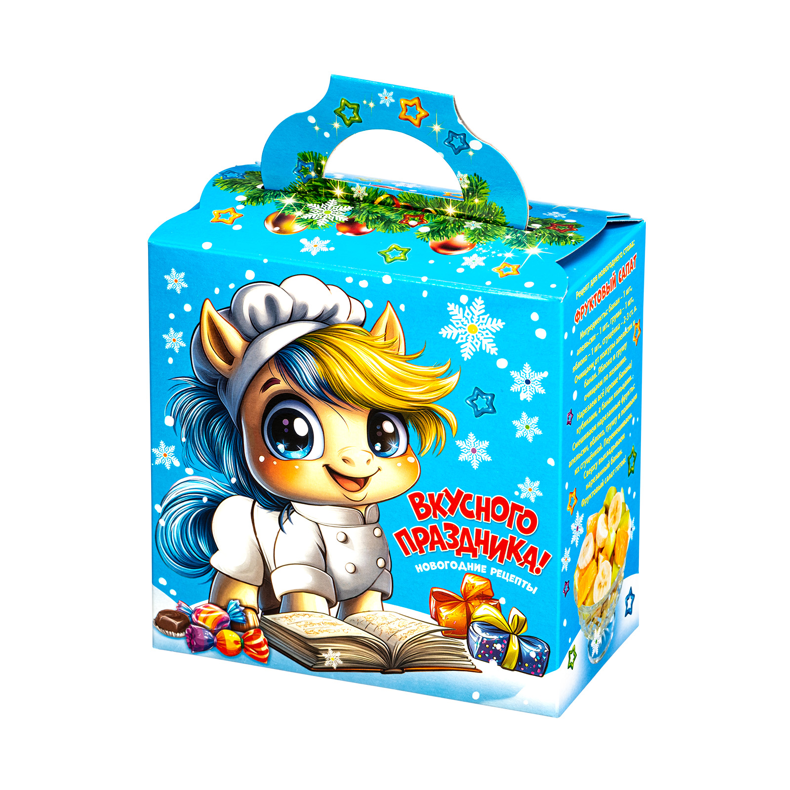 Ищете новогодний сладкий подарок для праздника в детском саду? Обратите внимание на набор “Поваренок Гоша”. За счет небольших размеров и грамотно подобранного конфетного состава этот подарок идеально подойдет для деток дошкольного возраста. Это коробочка нежно голубого цвета, со всех сторон украшенная разнообразными фигурными снежинками. На фронтальной части набора есть довольно милый рисунок: маленький очаровательной жеребенок в поварском кителе, который изучает книгу рецептов. Справа на упаковке как раз напечатан один из рецептов этой волшебной книги - обязательно приготовьте этот салат на новогодних праздниках!