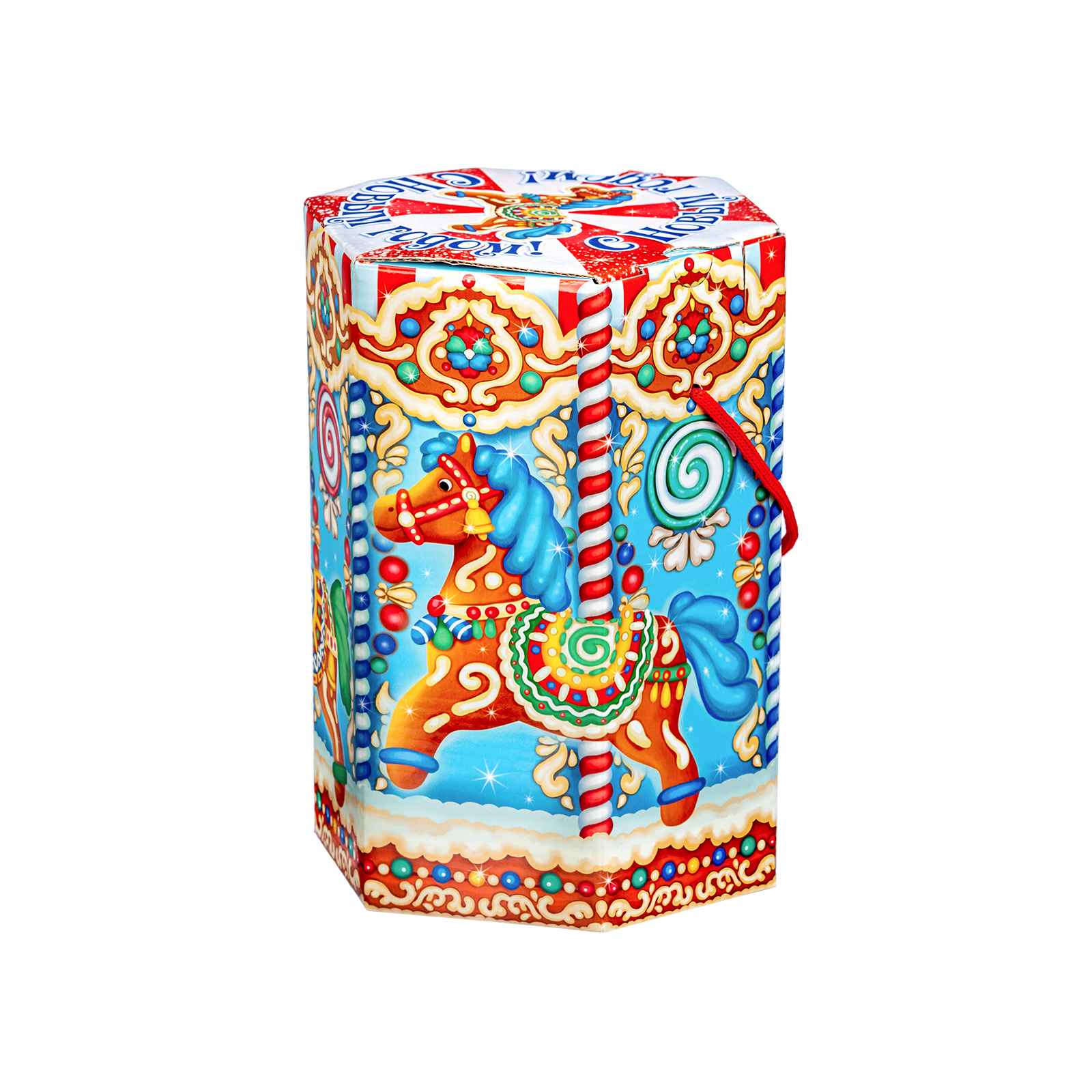 Интересный вариант новогоднего подарка – «Пряничная карусель». Он представлен в разделе Картон. Отлично подойдет на подарок в 2026 году с символом Лошадь. Внутри такого презента находится кондитерский набор весом 800 граммов.