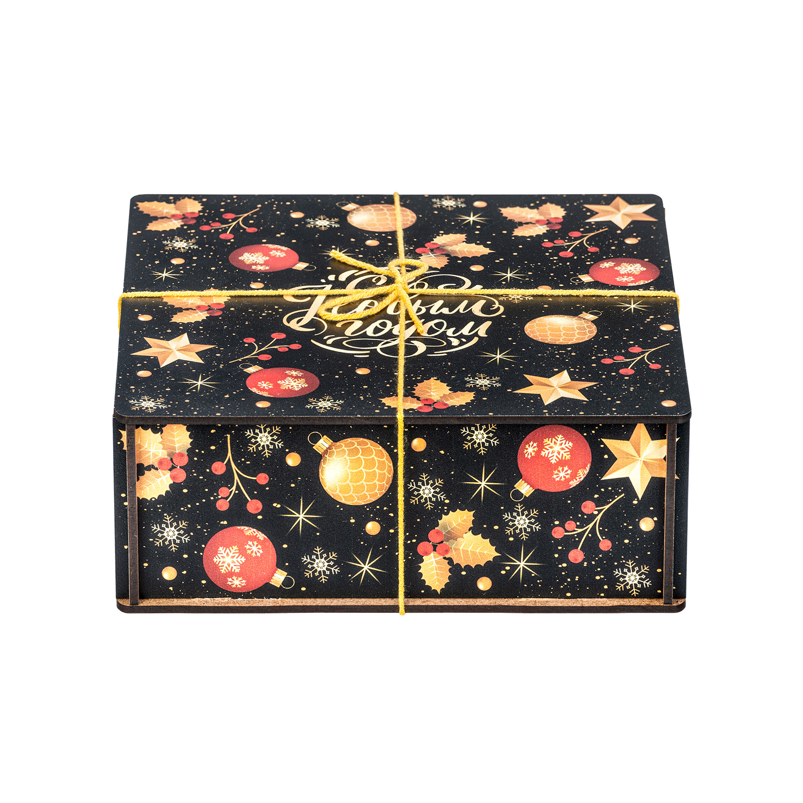 “Рождественская магия” - это новогодний сладкий подарок, отличающийся довольно строгим и оригинальным дизайном. Это небольшой деревянный ящичек темного цвета, украшенный новогодними иллюстрациями и перетянутый ярко-желтой веревкой. Внутри этого ящичка бережно хранятся отборные вкусные сладости и небольшой памятный сувенир в виде лошадки - символа 2026 года. Такой подарок идеально подойдет для поздравления любого взрослого сластены: воспитателя, классного руководителя, коллеги или начальника! Такой набор гарантированно вызовет приятные эмоции у того, кто его получит.