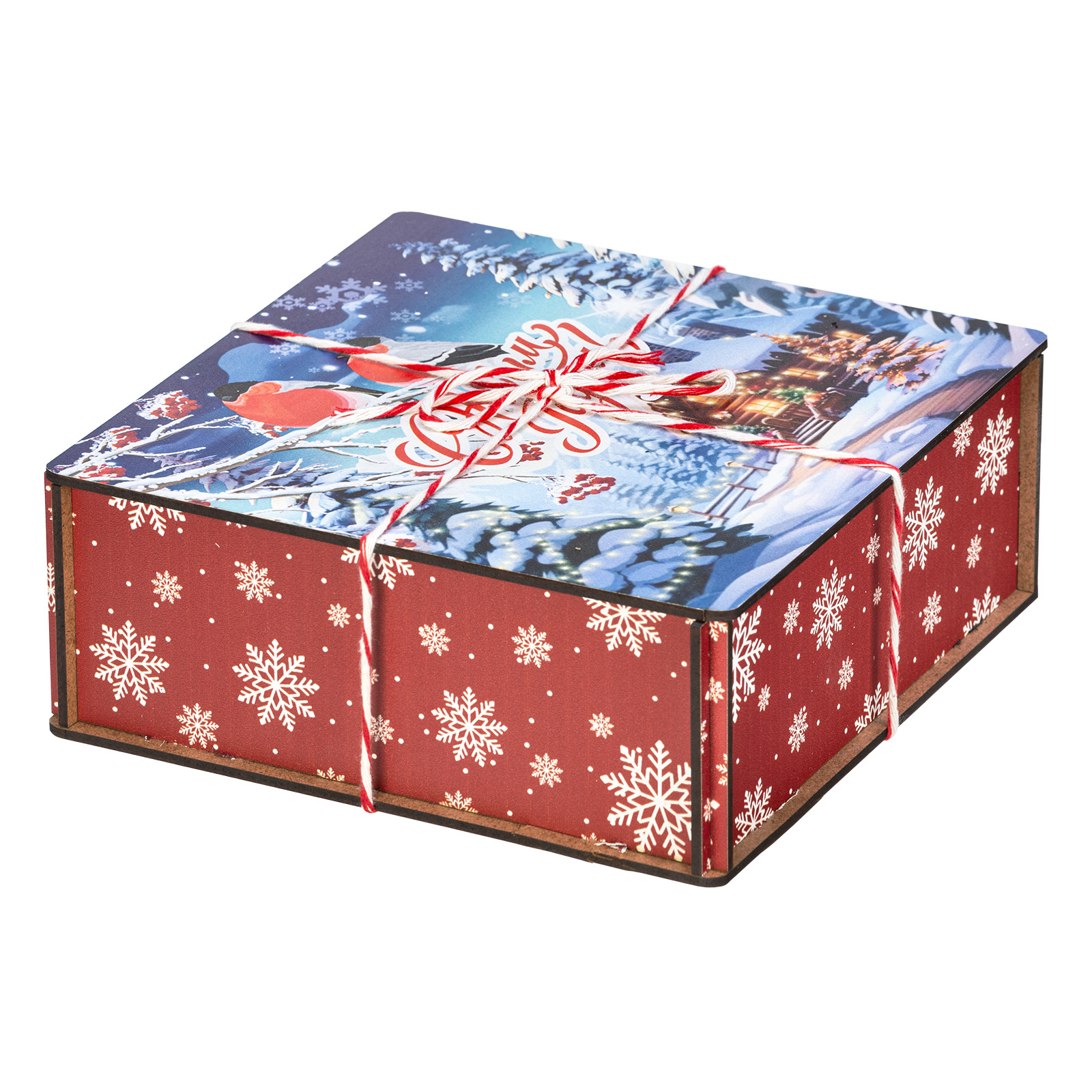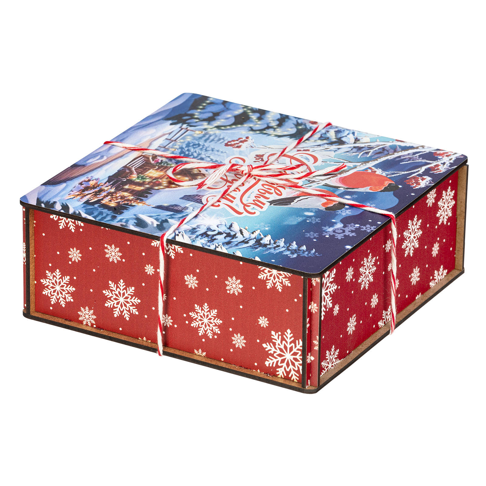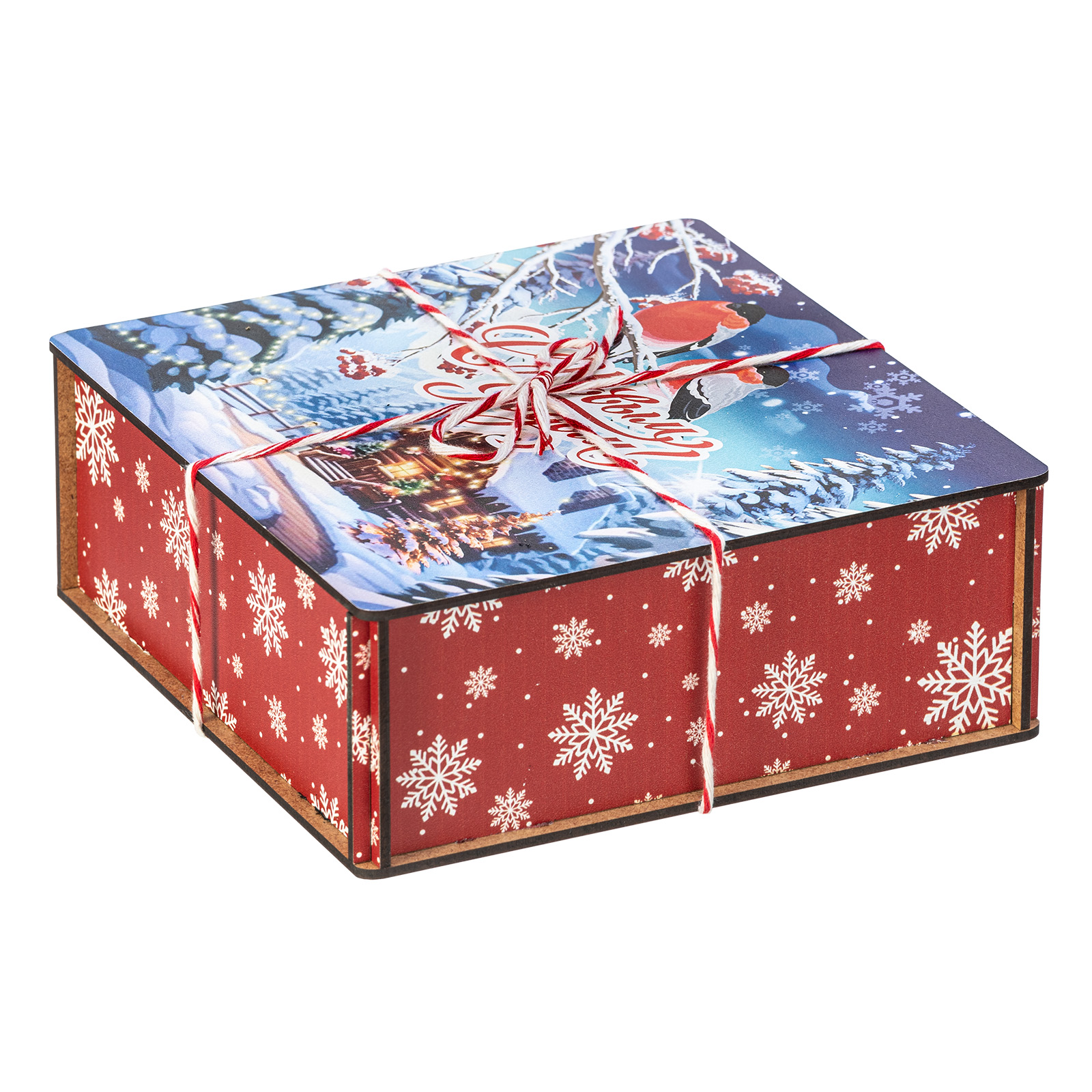 Сладкие подарки в деревянных упаковках - это сочетание оригинальности и безупречного вкуса сладостей. Набор “Январские птицы”  идеально подходит в качестве презента сластене любого возраста. Это деревянный ящичек размером 18х18х7, перетянутый праздничной веревкой-шнурком. На крышке ящика изображена завораживающая иллюстрация в виде заснеженной зимней деревни, а на переднем плане красуются главные герои - красногрудые красавцы-снегири, гордо сидящие на еловой веточке. В состав подарка входит 600 грамм вкусных разнообразных сладостей от ведущих кондитерских предприятий страны, а также небольшой памятный сувенир, который еще долго будет сохранять в себе атмосферу новогодних праздников.